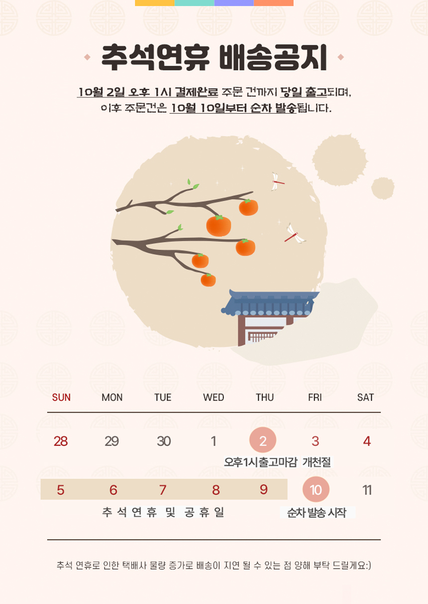 - 평일 오후 1시까지 결제 완료 건에 한해 당일 출고 됩니다. (토,일,공휴일 주문 건 익 영업일 발송)